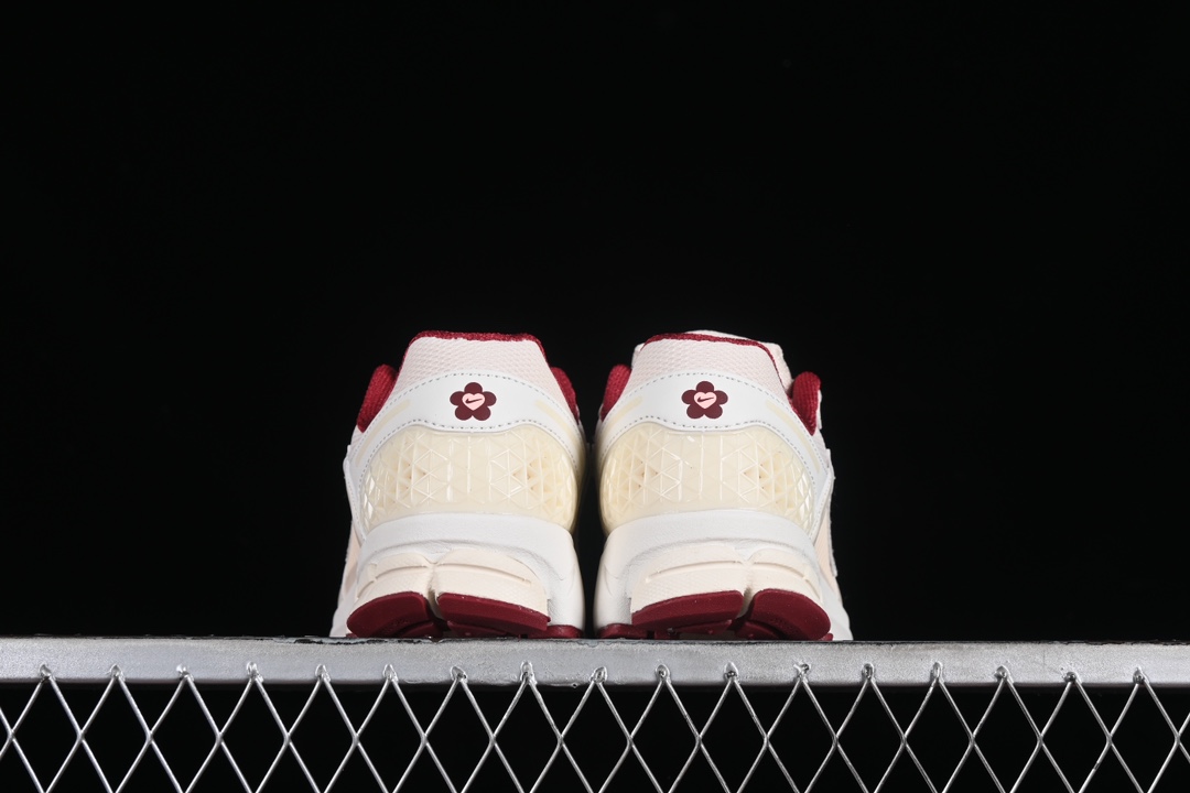 La chaussure présente une combinaison de matériaux de haute qualité, incluant du cuir et du mesh respirant, ce qui assure à la fois durabilité et ventilation optimale. La palette de couleurs est dominée par le blanc, avec des touches de rouge et de rose qui ajoutent une dimension festive et romantique au design.
