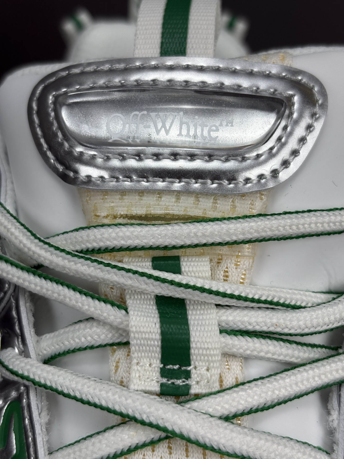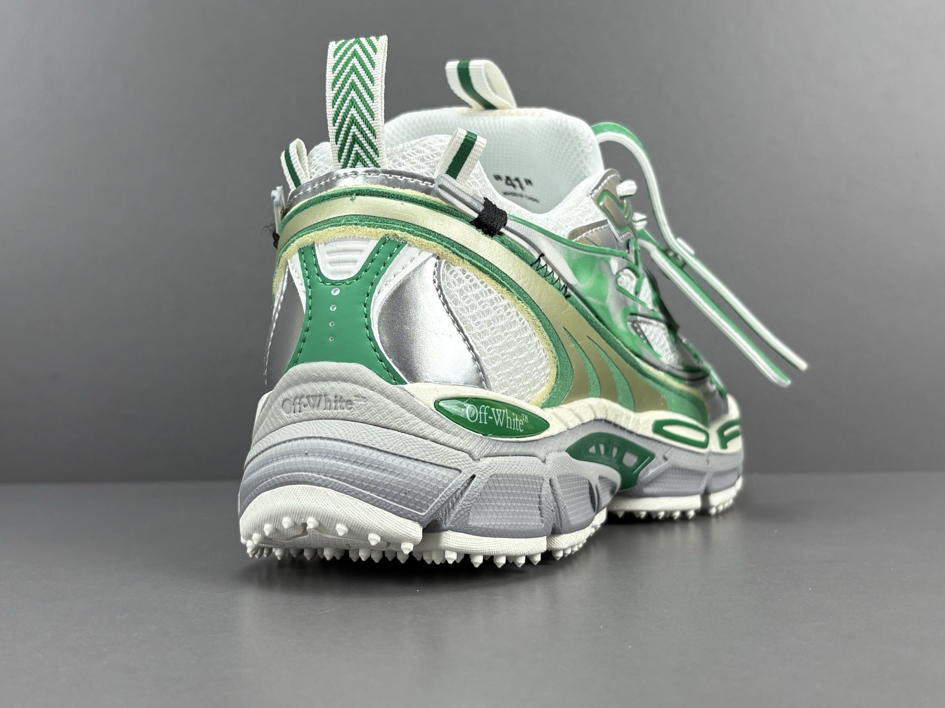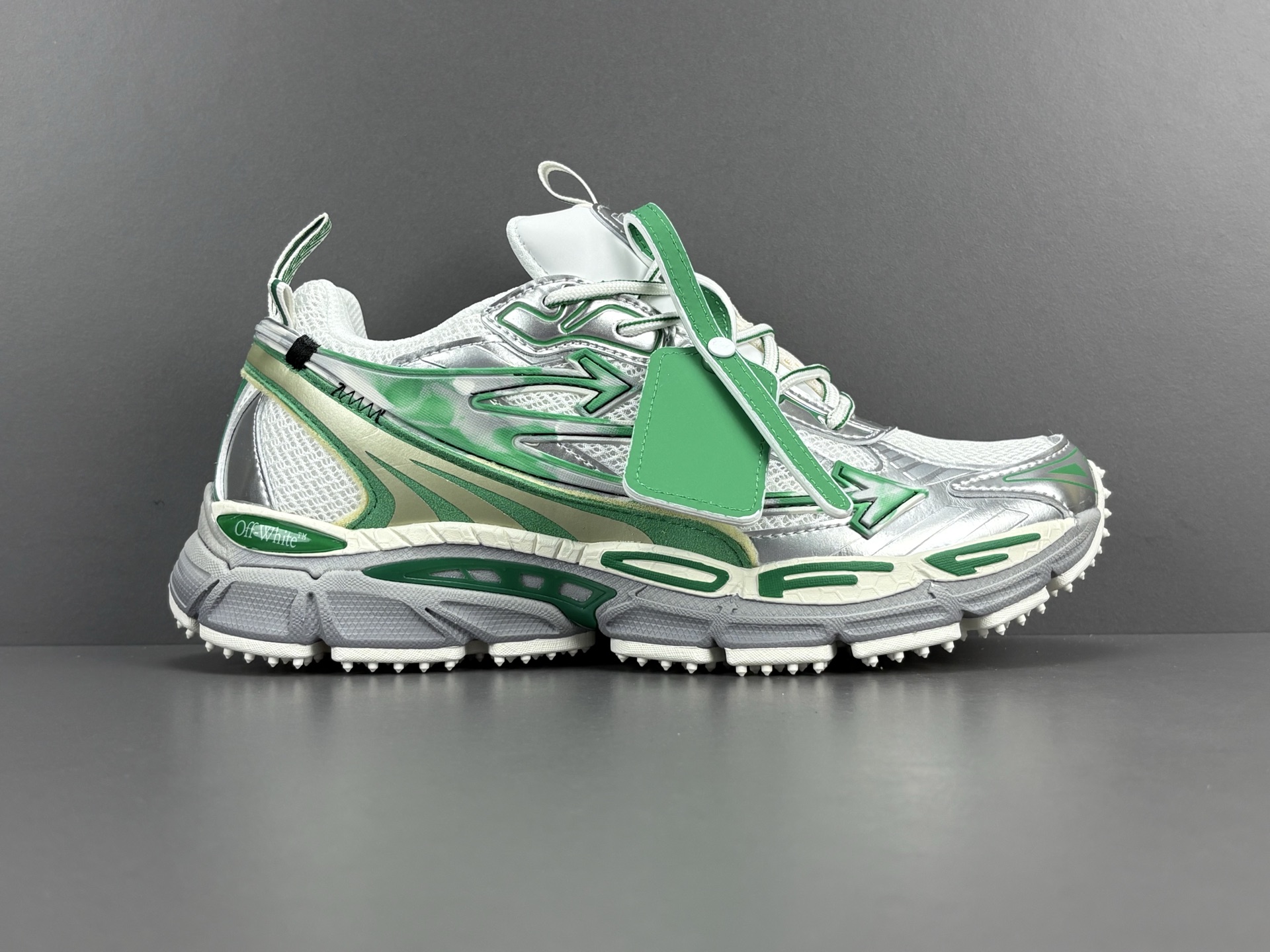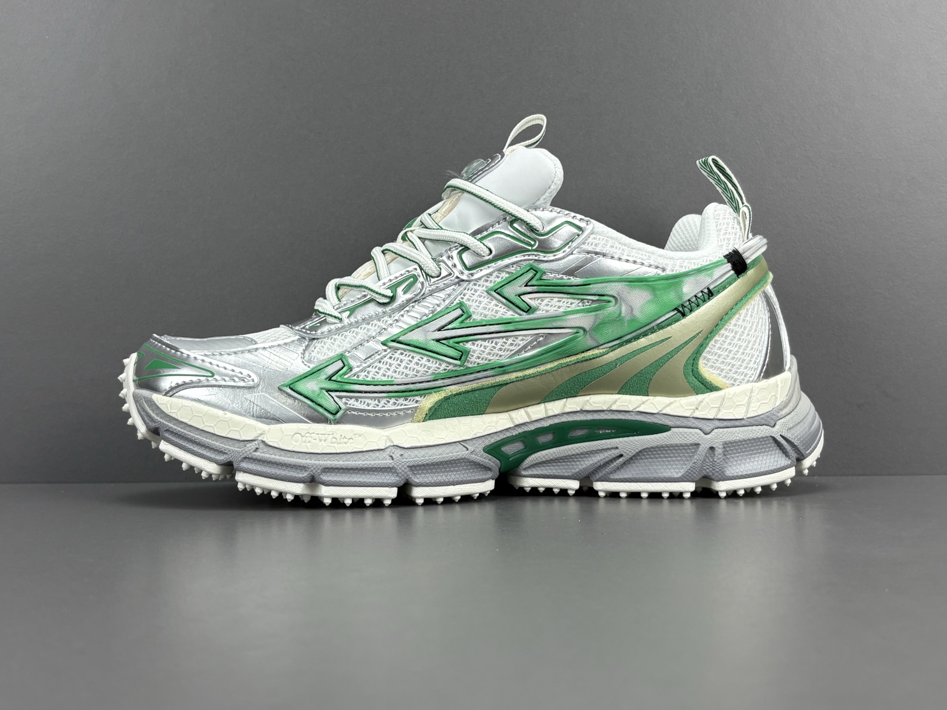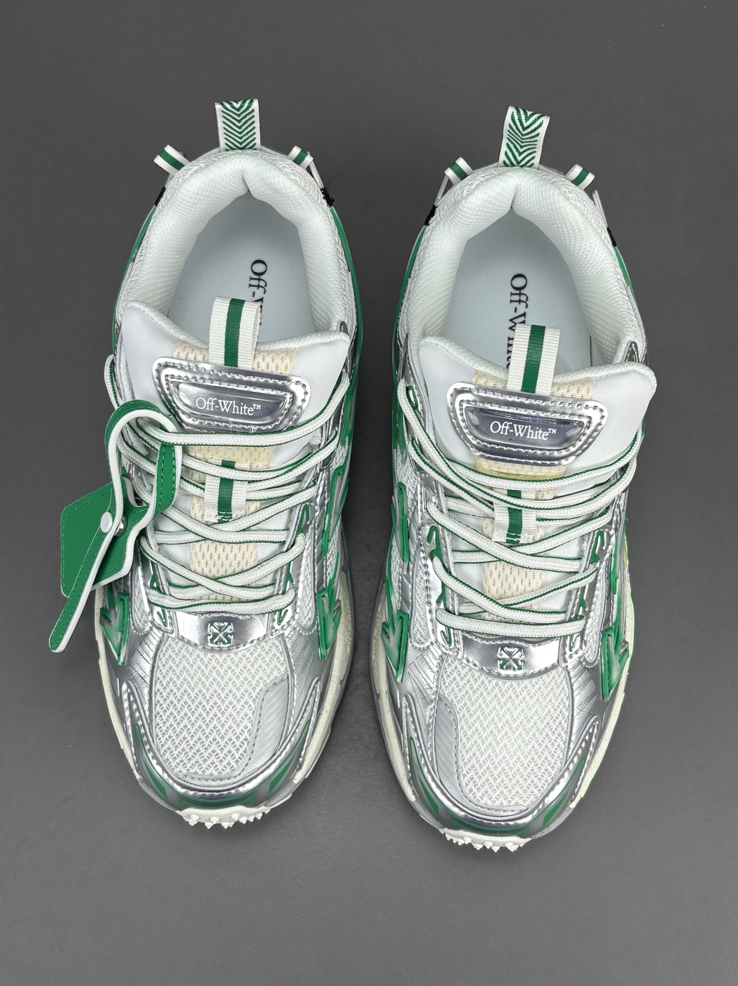 La couleur principale du sac est un argenté brillant, qui lui confère un aspect futuriste et audacieux. Des accents turquoise viennent compléter le design, ajoutant une touche de couleur vive et contrastée qui attire le regard. Le logo emblématique d’OFF-WHITE est présent, souvent sous forme de flèches croisées ou de texte, soulignant l’identité de la marque.