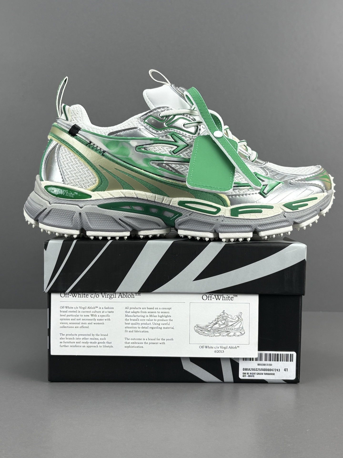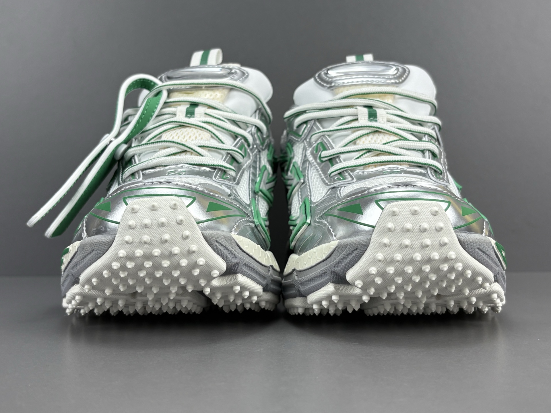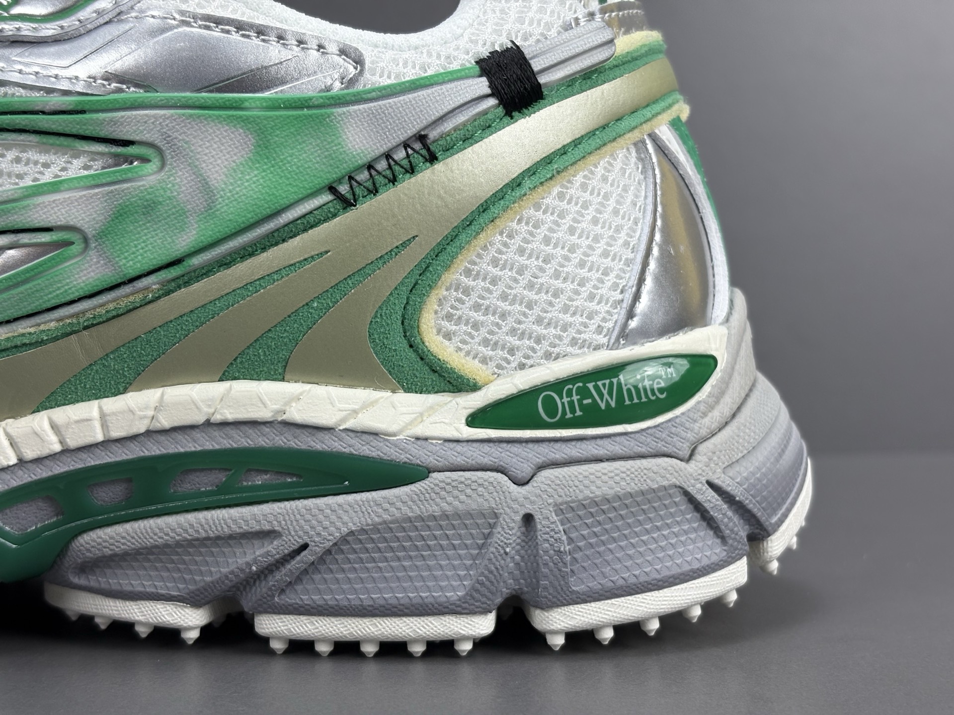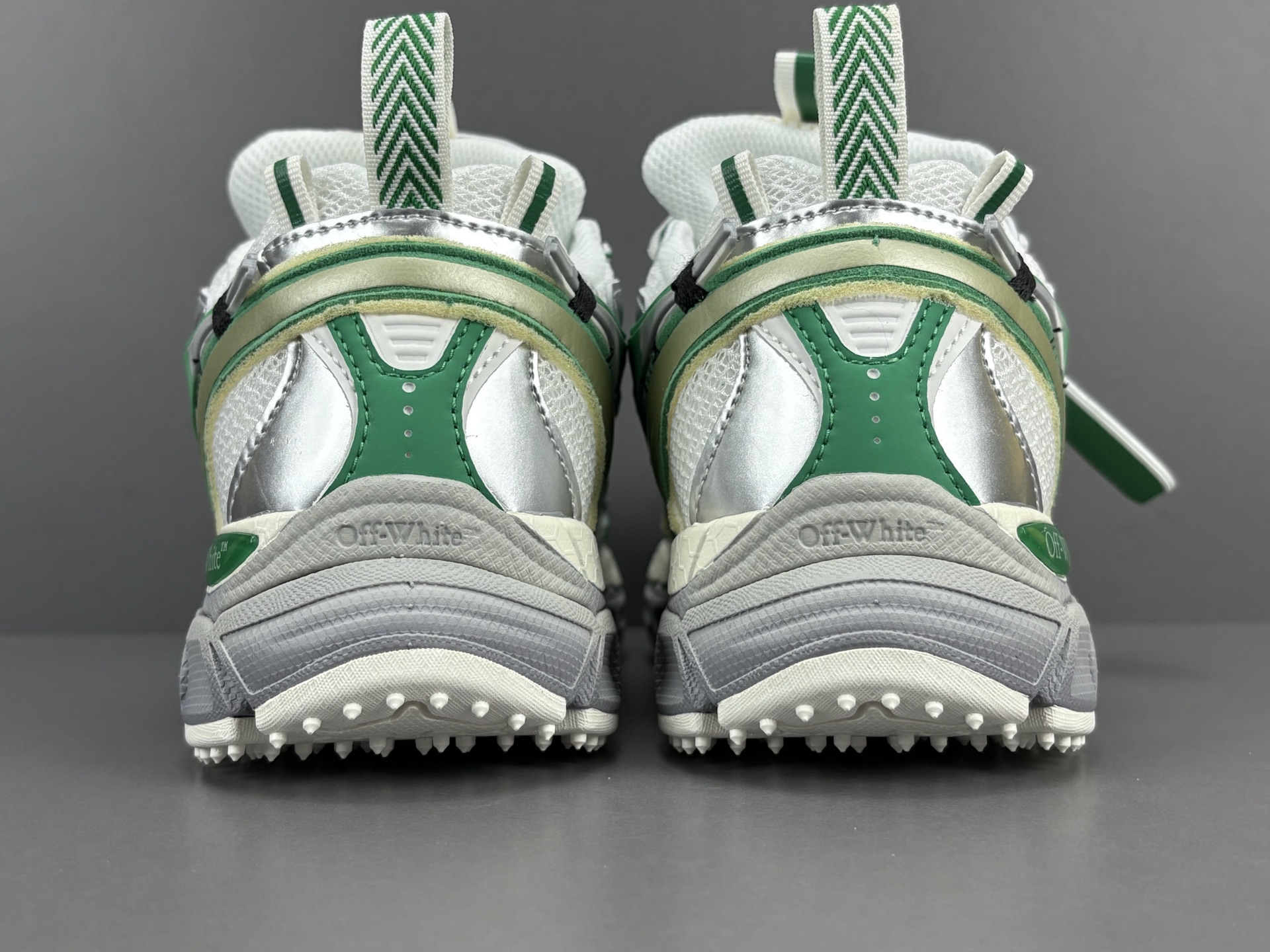 La couleur principale du sac est un argenté brillant, qui lui confère un aspect futuriste et audacieux. Des accents turquoise viennent compléter le design, ajoutant une touche de couleur vive et contrastée qui attire le regard. Le logo emblématique d’OFF-WHITE est présent, souvent sous forme de flèches croisées ou de texte, soulignant l’identité de la marque.