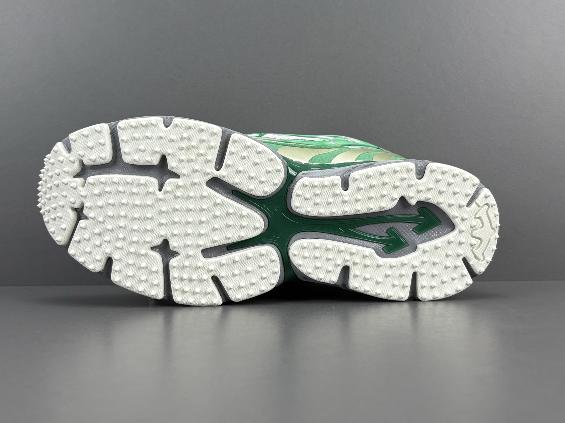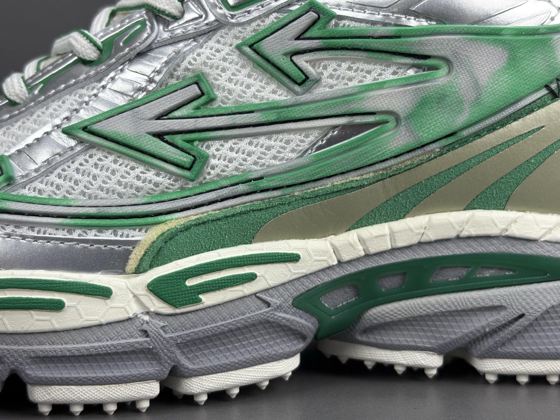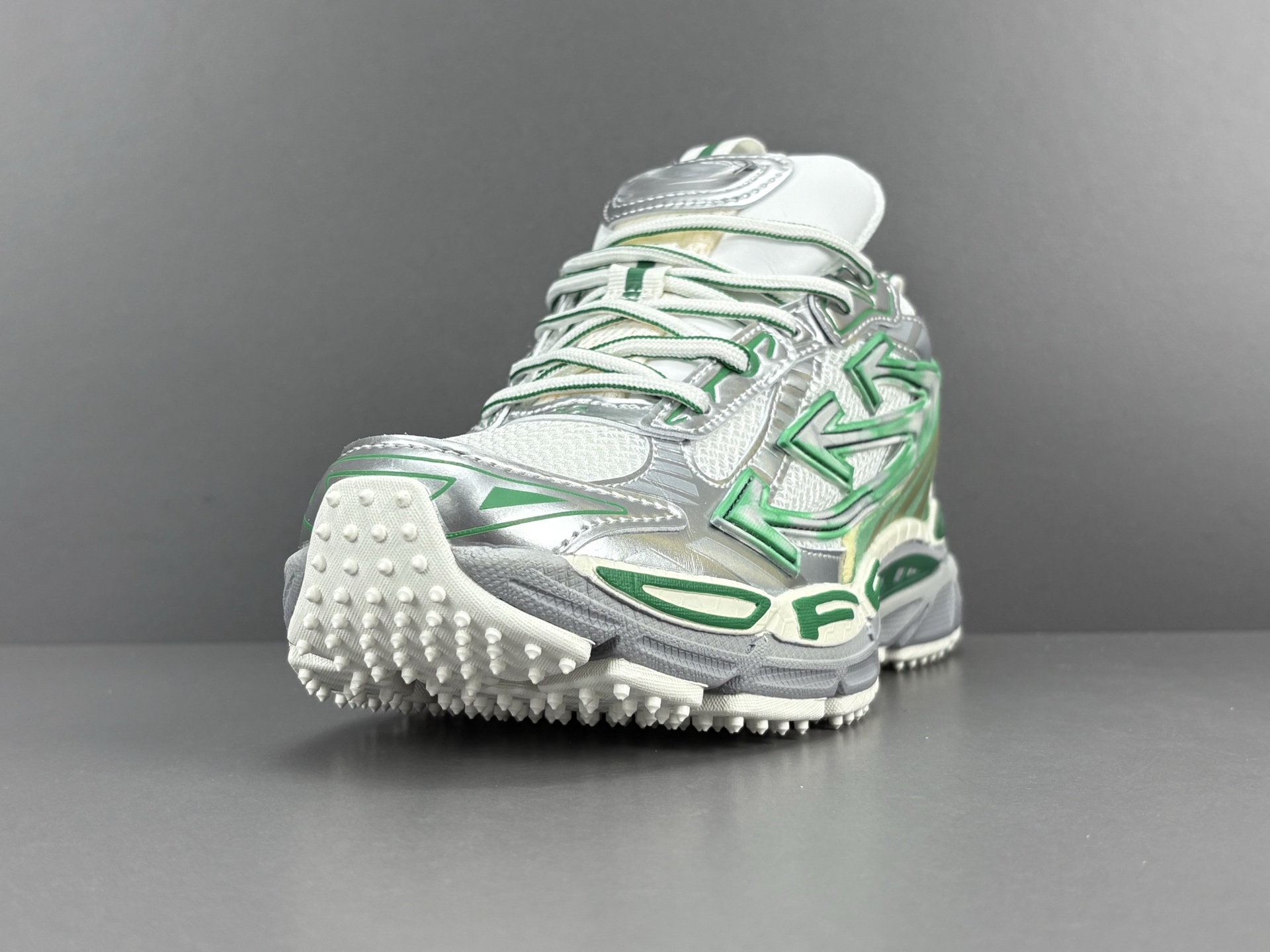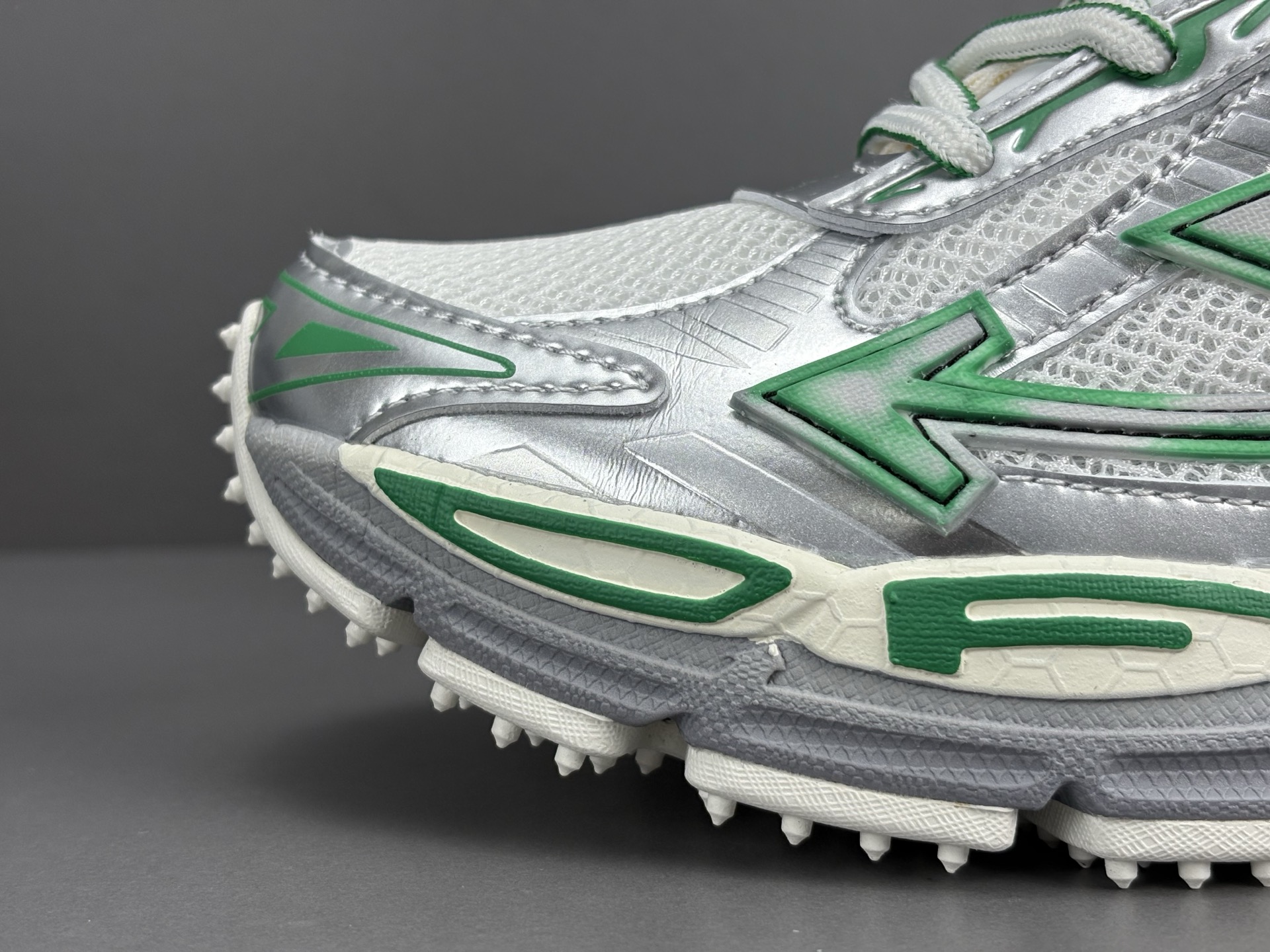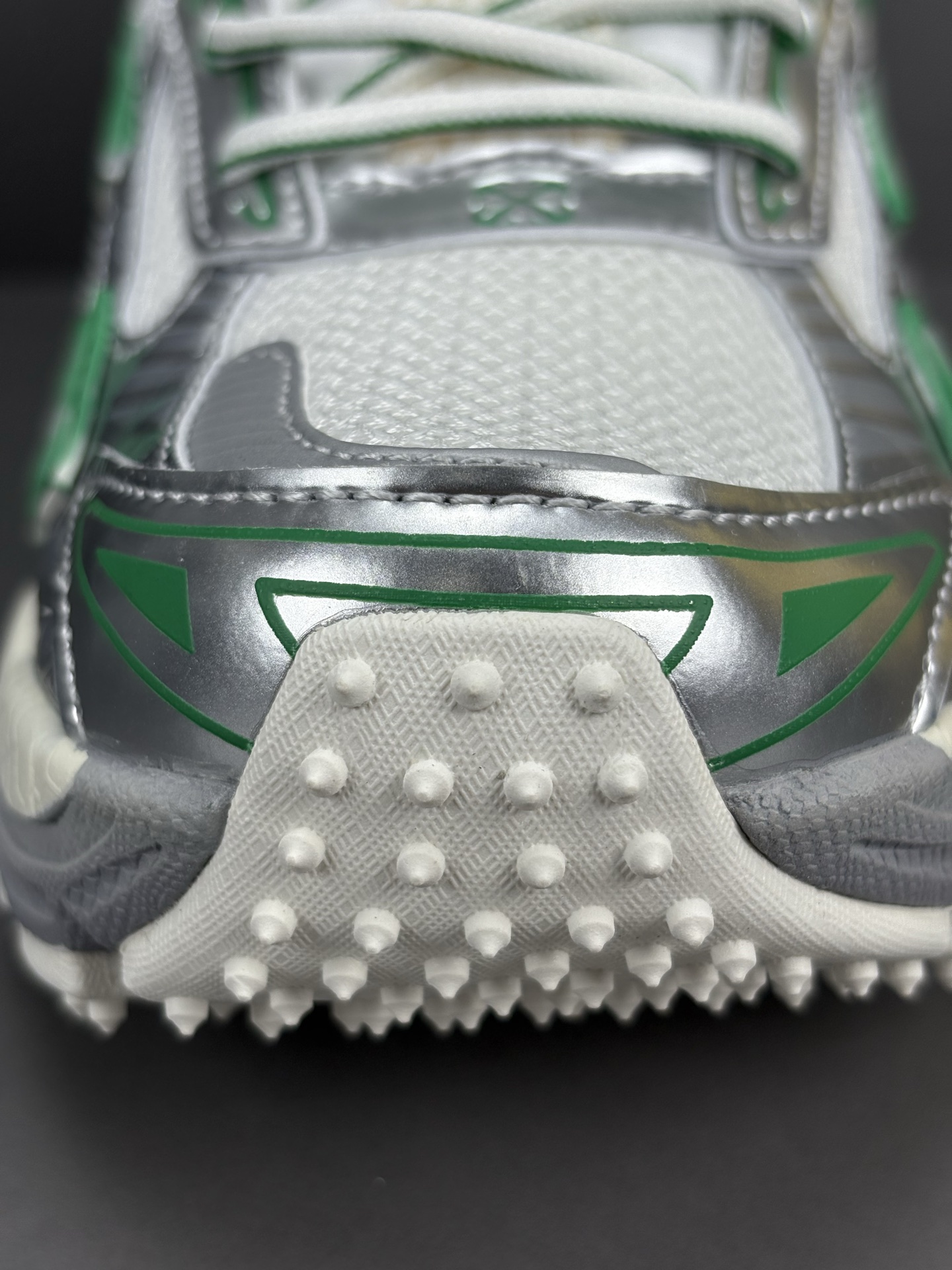 La couleur principale du sac est un argenté brillant, qui lui confère un aspect futuriste et audacieux. Des accents turquoise viennent compléter le design, ajoutant une touche de couleur vive et contrastée qui attire le regard. Le logo emblématique d’OFF-WHITE est présent, souvent sous forme de flèches croisées ou de texte, soulignant l’identité de la marque.