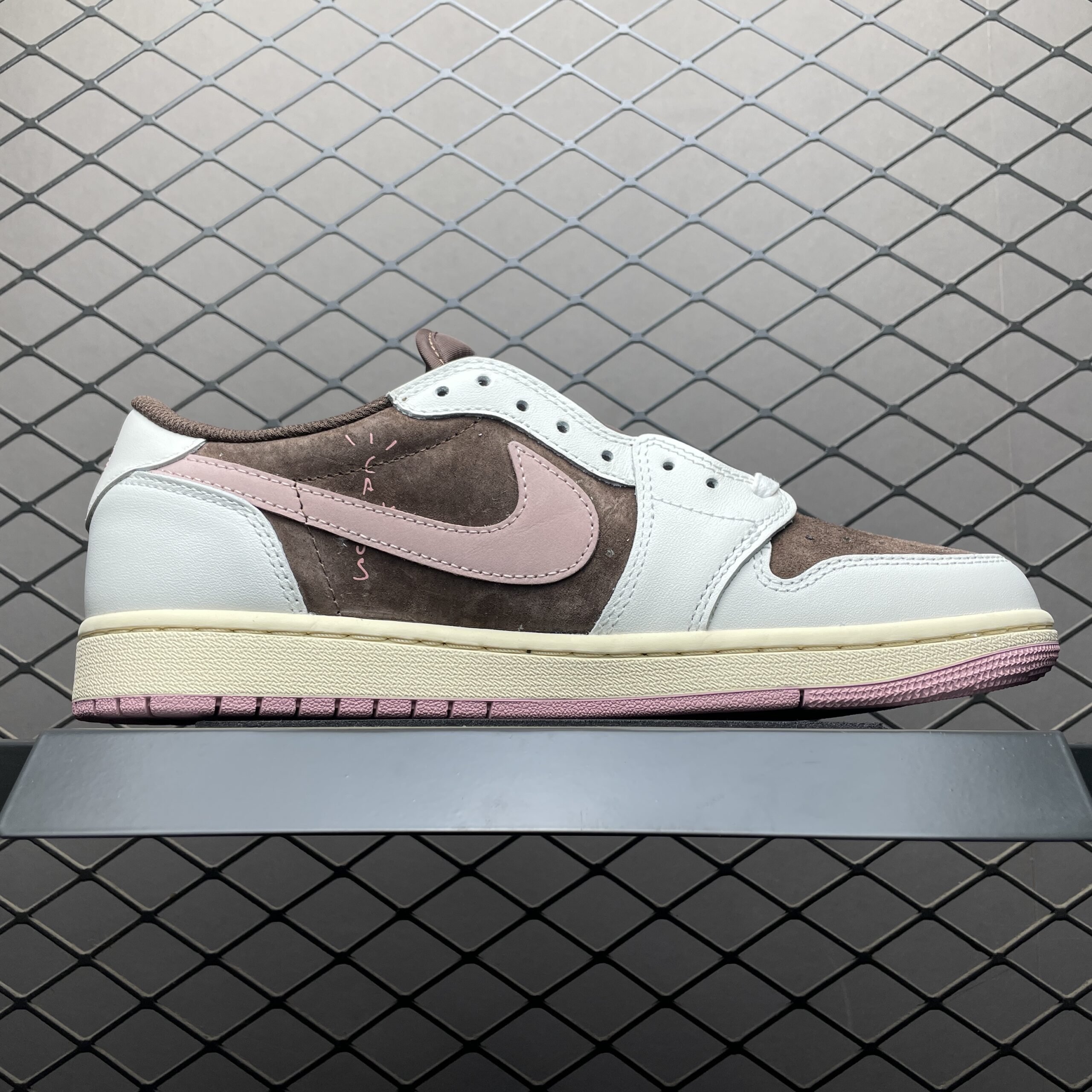 Mais ce qui distingue vraiment ces chaussures, c’est leur design unique. Les teintes roses audacieuses se marient parfaitement avec les détails noirs, créant un contraste frappant qui attire l’attention. Le logo emblématique de Travis Scott est fièrement affiché sur le côté, ajoutant une touche de style hip-hop à ces chaussures.